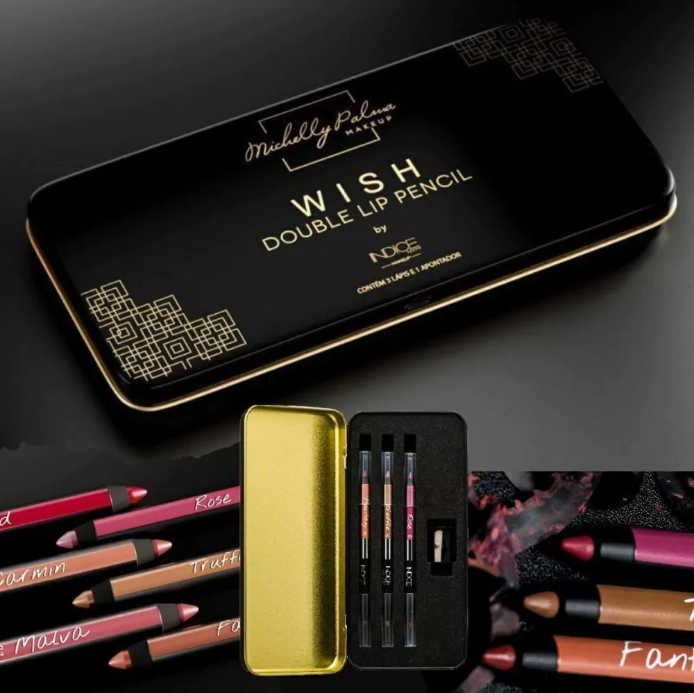 WISH Double Lip Pencil. Possui fórmula à prova d'água, alta cobertura, garantindo um traço marcante e resistente à água. Assim, deixando sua maquiagem de altíssima qualidade.